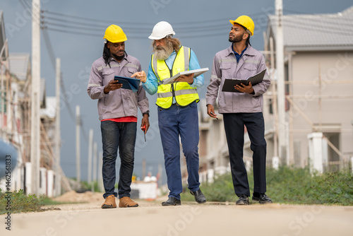 Structural engineer and worker working with blueprints discuss at the construction site. Engineers on building site. Two worker or labor and one engineer are reviewing the project. Architecture.