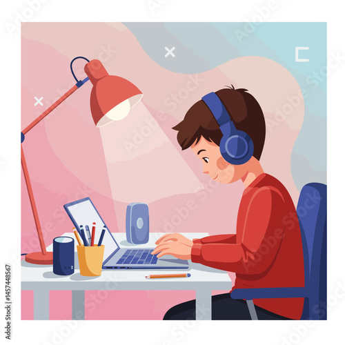 Student Focused on Studying: An illustration depicting a focused student diligently working on their laptop, immersed in their studies. Their headphones suggest concentration.