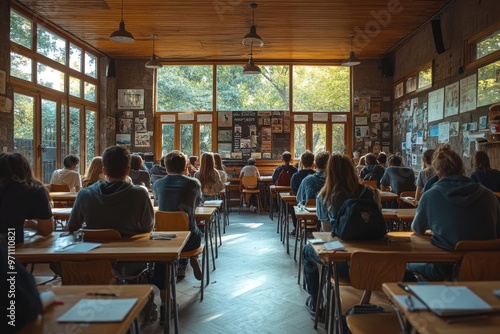 Students sit in a classroom. This photo captures the daily life of students in a classroom setting.