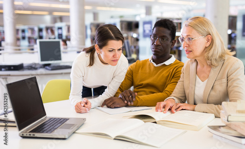 Students sitting in library, working with professor. High quality photo