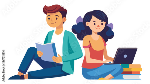student, studying, boy, girl, book, laptop, education, study, sharpened, collaboration, school, learning, academic, cognition, concentration, book, floor, stack, focused, dedication, vector