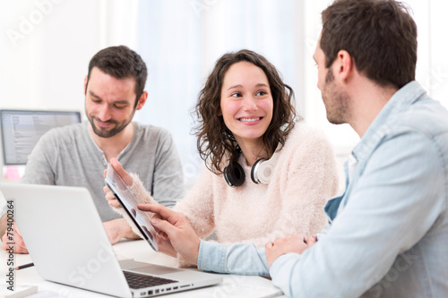 student, man, woman, work, tablet, group, report, account, technology, school, high, university, homework, 20s, smile, happy, complicity, human relationships, earphones