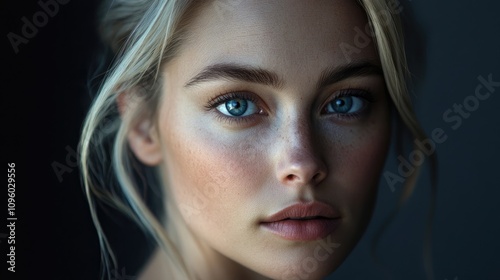 Studio portrait of a blonde woman, characterized by her piercing blue eyes, exuding confidence and elegance. This captivating portrait highlights her unique features with ample copy space.