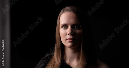 Studio portrait of a young blonde woman with serious expression in dark background and low key lighting