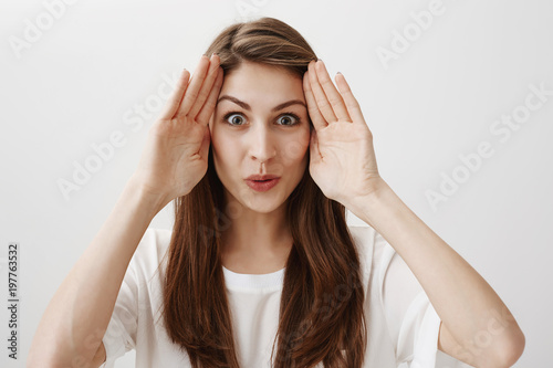 woman, girl, female, girlfriend, advertisement, advertising, student, background, businesswoman, beautiful, joyful, stylish, trendy, pleased, smile, happy, grinning, positive, fashion, person, face, amazed, cute, emotional, excited, brunette, expressive, portrait, pretty, studio, young, youth, gesticulate, glad, joy, horizontal, smiling, grey, astonished, isolated, surprised, cheerful, emotion, hand, amazement, adult, casual attire, expression, pointing, confident