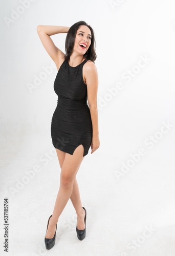 Studio portrait photo of a young beautiful elegant Brazilian female model lady wearing a black dining dress posing with a series moments of emotion and gesture