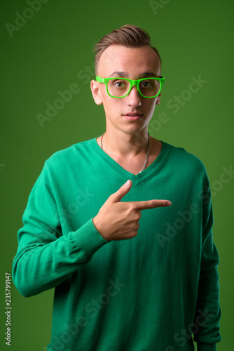 Studio shot of young handsome man against green background