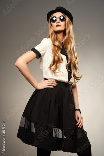 attractive, woman, blouse, skirt, long hair, sunglasses, hat, adult, beautiful, beauty, black, caucasian, charming, cheerful, posh, clothes, clothing, elegant, fashion, fashionable, female, feminine, girl, glamour, hair, happiness, happy, holiday, human, joyful, lady, model, modern, natural, people, person, portrait, posing, pretty, relaxed, romantic, sexy, smiling, studio, stylish, summer, vitality, white, young
