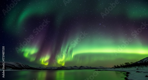 aurora, borealis, aurora borealis, night, sky, star, lake, water, landscape, scenery, nature, environment, outdoors, cosmic, celestial, green, purple, blue, colours, vibrant, beautiful, tranquil, peaceful, serene, calm, horizon, dark, energy, atmosphere, view, travel, tour tourism, exploration, adventure, wonder, natural, glowing, shining, background, copy space, creative, visual, design, illustration, photo