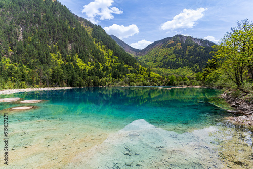 stunning, blue, lake, jiuzhaigou, national park, sichuan, china, vale, spring, flower, blossom, cherry, landscape, nature, water, beautiful, mountain, scenic, scenery, peaceful, crystal, idylli, turquoise, clear