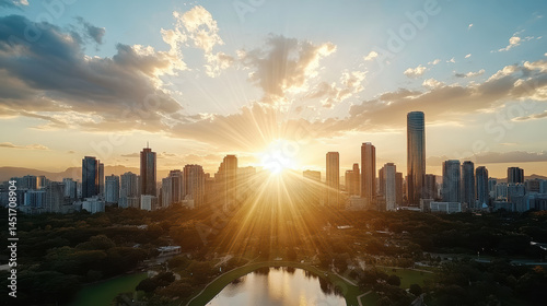 Stunning city skyline sunset with rays of light shining through clouds, creating warm atmosphere