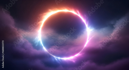 Stunning cosmic eclipse with vibrant glowing ring surrounded by dark clouds and colorful nebulae in a deep space scene perfect for science fiction themes and astronomical concepts