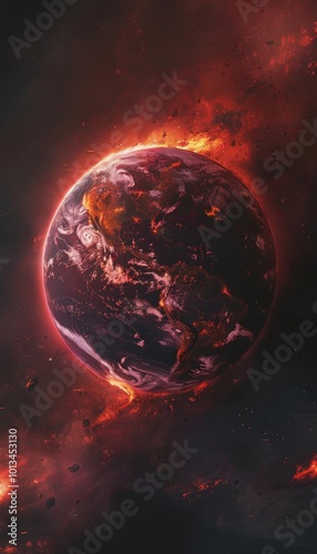 Stunning depiction of earth ablaze from space, flames and smoke highlighting catastrophic beauty