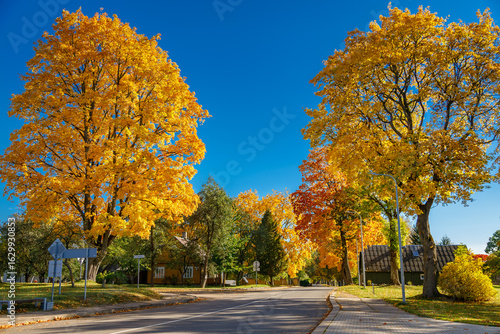 autumn, tree, street, gold, stunning, lining, peaceful, lithuania, vibrant, fall, foliage, brilliant, blue, sky, yellow, orange, colourful, seasonal, nature, landscape, rural, village, road, sidewalk, house, residential, bright, sunny, leaf, canopy, branch, european, baltic, historical, cultural, tour tourism, travel, destination, architecture, traditional, picturesque, serene, tranquil, spectacular, magnificent, breathtaking, idylli