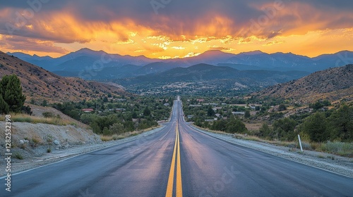 highway, landscape, sunset, mountain, scenery, road, travel, nature, sky, cloud, horizon, view, daylight, scenic, calmness, adventure, exploration, asphalt, vale, high-coloured, gold, panoramic, wilderness, beauty, environment, distant, sunrise, dusk, peaceful, cloudy, solitude, breathtaking, journey, direction, rural, dramatic, countryside, immensity, open, light, warmth, summer, evening, natural, calm, escape