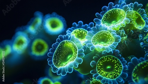 Stunning Macro View of Bioluminescent Algae Clusters in Dark Abyss