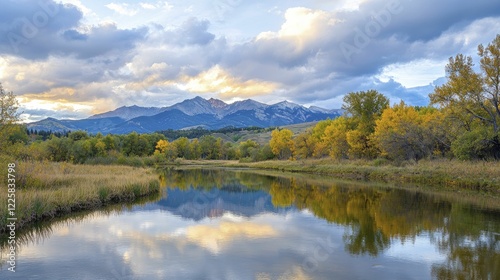 Stunning mountain range at sunrise with dramatic clouds, showcasing vibrant colors and serene reflections in a tranquil lake.