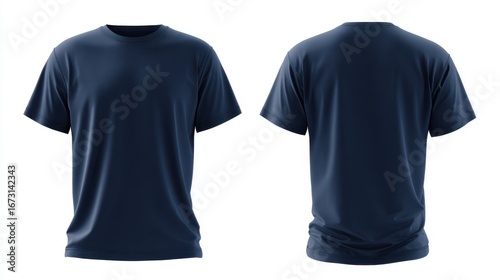 Stunning photo of navy blue t-shirt mockup. Design template for print. Clean front, back view on white background. Apparel textile clothing for casual attire or activewear.