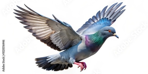 pigeon, isolated, white background, flying, sky, bird, nature, wildlife, animal, flight, elegant, graceful, feather, avian, beautiful, natural, photo, soaring, movement, dynamic, freedom, outdoors, minimalistic, artistic, scenic, aviary, birding, peaceful, stunning, vibrant, detailed, expressive, majestic, air, cloud, blue skies, composition