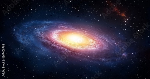 Stunning pink and yellow spiral galaxy with a glowing core and stars in the vast universe
