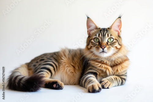 cat, felino, pet, animal, tabby, breed, domestic, portrait, cute, fluffy, whisker, ear, eye, green, paw, tail, fur, stripes, pattern, brown, black, beige, white, studio, isolated, purebred, short hair, mammal, kitten, beautiful, posing, looking, calm, relaxed, lay, resting, elegant, wildcat, lynx
