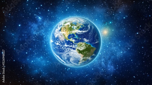 Stunning realistic Earth planet in space with illuminated continents and cloud cover, surrounded by vibrant stars and cosmic nebulas, showcasing advanced detailed textures, deep blue