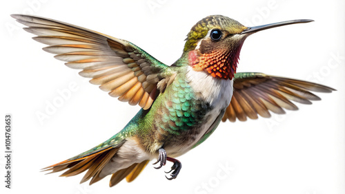 Stunning ruby throated hummingbird captured mid-flight with iridescent plumage and delicate wings, showcasing nature's vibrant beauty and incredible agility