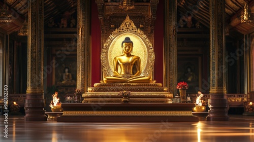 Stunning Southeast Asian temple with golden Buddha statue, spiritual and serene atmosphere
