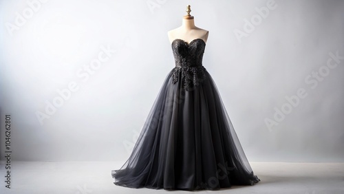 fashion, evening gown, strapless, black, lace, tulle, elegant, mannequin, isolated, white