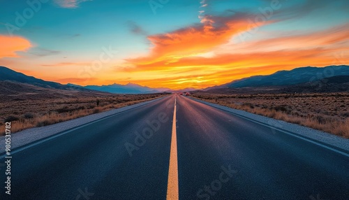 Stunning sunset over a long stretch of open road, with mountains and vibrant colors in the backdrop, perfect for travel themes.