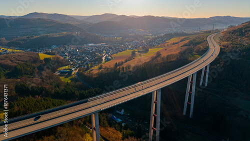 bridge, highway, aerial, drone, sunset, german, sauerland, infrastructure, engineering, architecture, massive, pillar, vale, forest, landscape, transportation, logistic, connection, industrial, symmetry, modern, road, traffic, construction, highest, concrete, cinematic, golden hour, transition, reveal, perspective, travel, tour tourism, twilight, structure, landmark, commerce, network, majestic, height, route, outdoors