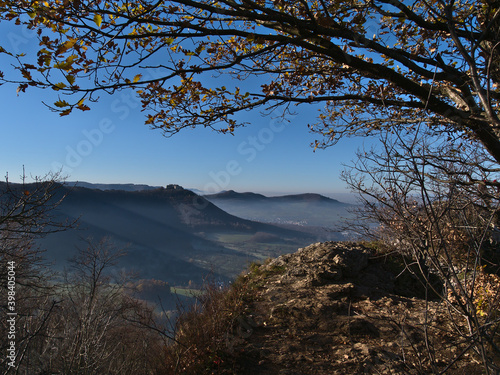 Stunning view of the foothills of low mountain range Swabian Alb with Hohenneuffen castle in the morning sun in late autumn with shadows and hazy air viewed from rocky hiking path under oak tree.