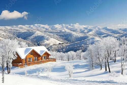 Stunning Winter Wonderland Mountain Log Cabin Surrounded by Snowy Trees and Majestic Landscape in a Peaceful Remote Forest