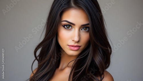 beautiful, young, woman, long, dark, hair, brown, eye, looking, camera, stunning, gaze, portrait, realistic, detailed, elegant, soft, lighting, photo, smooth, skin, natural, beauty, fashionable, expressive, face, sharp, sharpened, depth, captivating