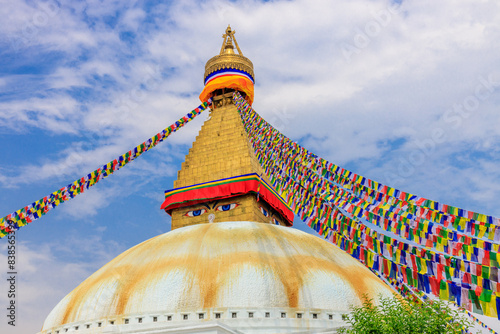 Stupa with Buddha eyes in Nepal. Religious building of buddhism pagoda in the high Himalaya mountains and Kathmandu capital city. Sacred place of Buddhism with prayer flags in beautiful peaceful place