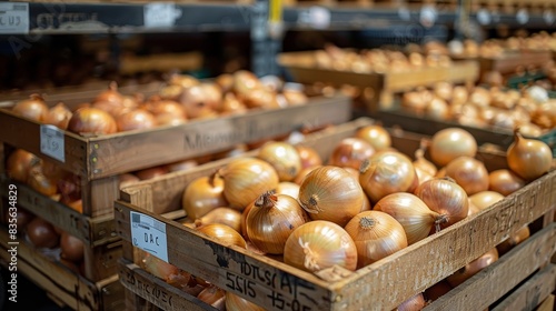 Sturdy crates of onions, with shipping labels attached, lined up in a distribution center