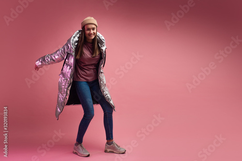 down jacket, jacket, puffy, fashion, trend, trendy, shiny, silver, metallic, autumn, youth, clothing, style, look, climber, warm, girl, woman, female, teenage, hat, jean, cool, fun, informal, hood, stylish, daring, dance, polyester, silhouette, comfortable, quilting, fit, outfit, lightweight, frost, coat, body, down, winter, clothes, pink, copy space, cute