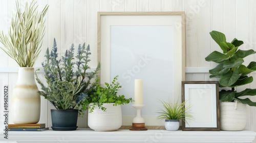 Stylish arrangement of plants and a planter in front of a white mantel, complemented by a canvas and photo frame for a modern look
