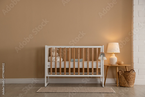 Stylish baby's room with crib, table and decor, space for text. Interior design