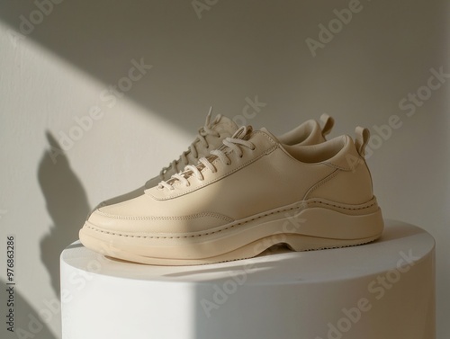 sneaker, beige, footwear, fashion, minimalist, casual attire, style, summer, trendy, design, display, natural light, pedestal, modern, chic, outfit, urban, artistry, comfortable, lifestyle, contemporary, stylish, athletic, unisex, aesthetic, shadow, simplicity, elegance, fashion accessories, unbranded, sunlit, versatile