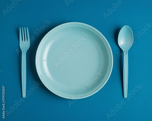 Stylish blue monochrome dining set with plate fork and spoon ready for modern food presentation and creative concepts, perfect for blogs and recipes