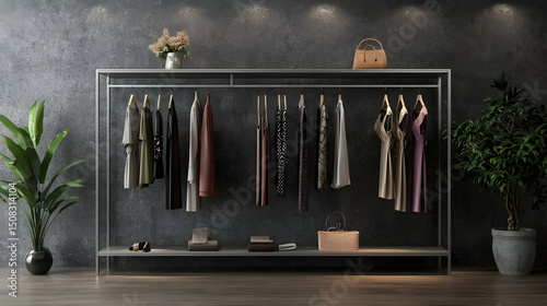 clothing store, fashion, clothes rack, dress, skirt, pant, accessory, rack, display, boutique, modern, minimalist, interior design, grey, brown, black, beige, metal, stone, plant, decor, shopping, retail, showroom, elegant, stylish, contemporary, trendy, fashionable, clothing