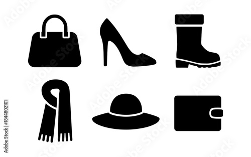 silhouette, icon, accessory, fashion, pursed, high heel, boot, foulard, hat, billfold, black, white background, clothing, style, design element, graphic, vector, isolated, minimalist, elegant, chic, modern, trendy, shopping, clothes rack, outfit, essential, footwear, purse, lady, woman, apparel, symbol