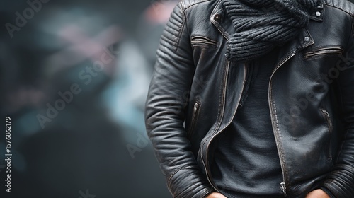 man, leather, jacket, foulard, urban, fashion, style, casual attire, confidence, portrait, outdoors, street, photo, trendy, adult, male, winter, comfortable, modern, accessory, dark, expression, relaxed, cool, lifestyle, detail, pose, elegance, warmth, informal, contemporary, attitude, artistic, textured, fashionable, rugged, background, closeup, photogenic, standing, individual, youthful, coolness, masculine, monochrome