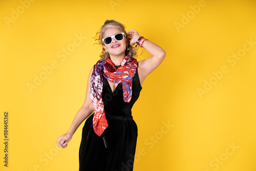 woman, mature, fashion, style, sunglasses, foulard, yellow background, posing, studio shot, elegant, confident, stylish, beauty, portrait, model, trendy, clothing, accessory, vibrant, colourful, happy, cheerful, positive, expression, lifestyle, middle-aged, adult, female, glamour, studio, isolated