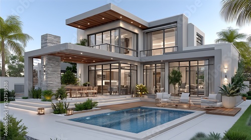 villa, luxury, modern, pool, architecture, glasses, house, patio, evening, deck, residence, minimalist, light, lounge, window, greenery, elegant, landscape, terrace, design, stylish, building, home, exterior, sky, estate, construction, balcony, window, apartment, new, roof, residential, garden, real, property, facades, real estate, urban, nobody