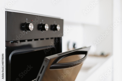 Stylish oven with open door in Nordic style kitchen
