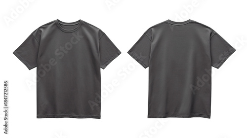 t-shirt, oversize, grey, dark, apparel, clothing, fashion, design, blank, template, front, back, view, garment, casual attire, wear, unisex, cotton, fabric, stylish, modern, trendy, urban, street, style, comfortable, loose, fit, simple, plain, empty, presentation, display, showcase, product, advertisement, online, store, e-business, shop, selling, marketing, promotion, brand, identity, creative, artistic, isolated