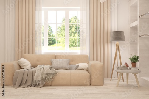 Stylish room in white color with sofa and summer landscape in window. Scandinavian interior design. 3D illustration
