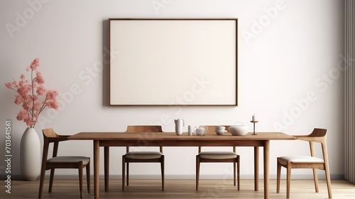 Stylish rustic interior of dining room with walnut wooden table, retro chairs, decoration, dried flower in vase and mock up picture frame in minimalist home decor. Template.